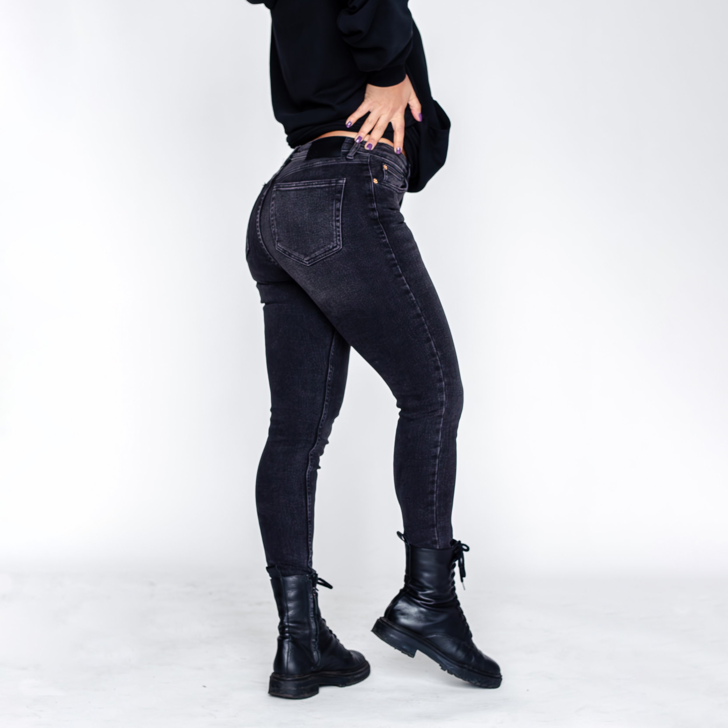 These high-waisted black skinny jeans are the perfect addition to your wardrobe for a trendy and edgy look. The acid wash finish gives them a unique, dark grey marbled appearance, while the high-rise fit and stretchy denim fabric provide a comfortable and flattering silhouette.