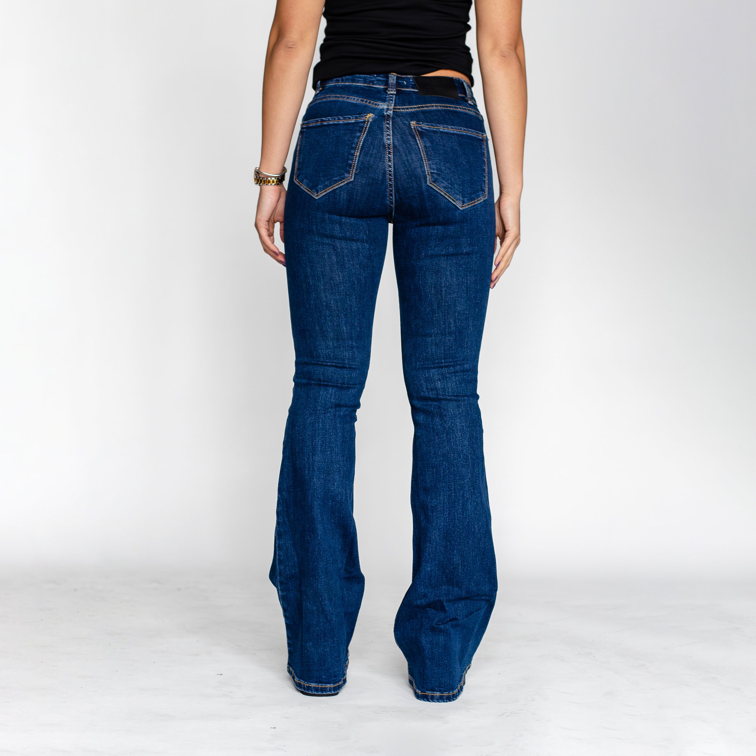 High Waisted Flare Jeans: Dark Blue Stretch Denim